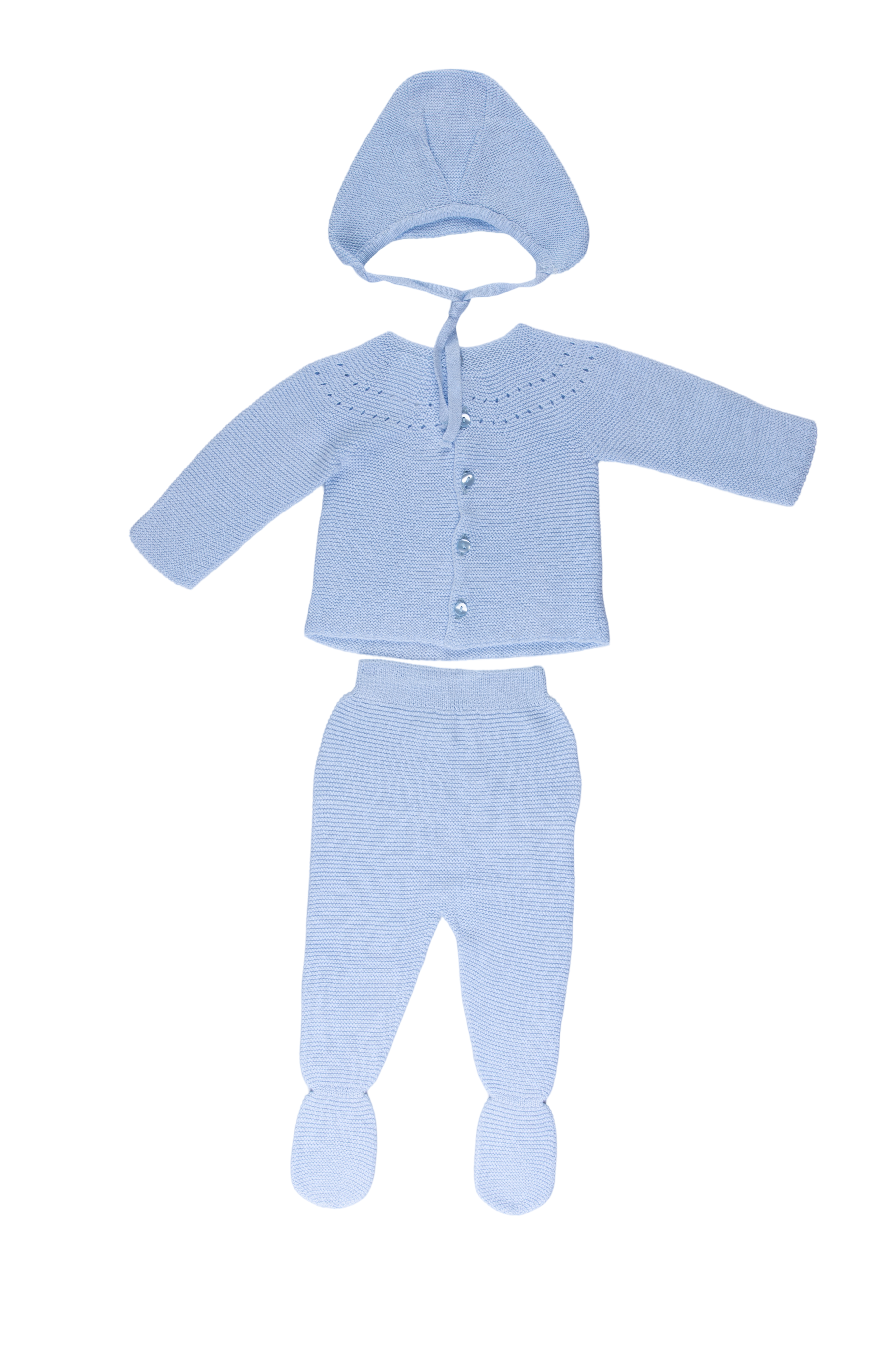 Il set è composto da 3 pezzi coordinati: maglia, ghette con piedino e cuffietta, tutti realizzati in morbido cotone, perfetto per le mezze stagioni.